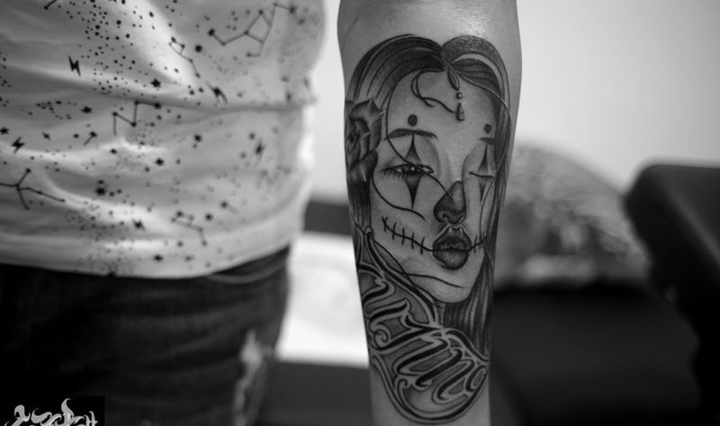 奇卡诺亡灵女郎纹身图片_欧美写实宗教情侣手臂纹身图案