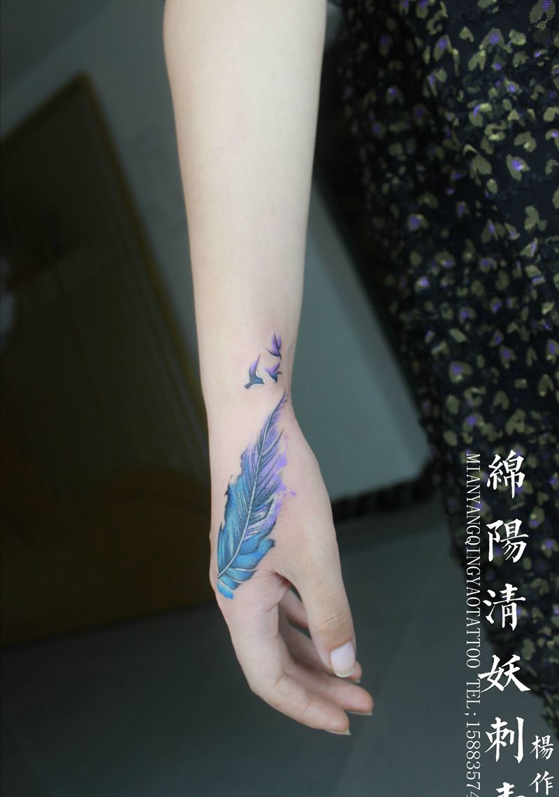 当前位置: 首页 >四川省绵阳市纹身店-绵阳清妖刺青纹身店纹身图案>羽毛纹身图片_手部水彩纹身图案