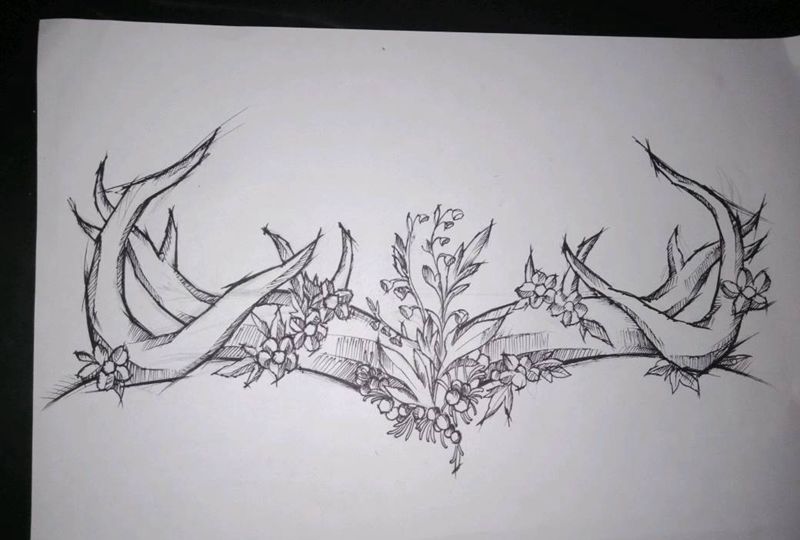 鹿角纹身图片_背部几何鹿角 素描纹身图案
