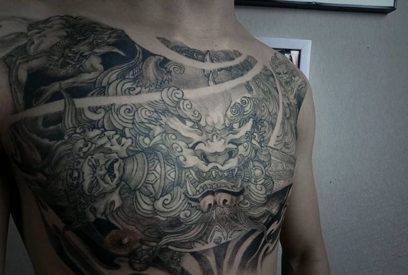 唐狮纹身图片_胸部新传统唐狮纹身图案