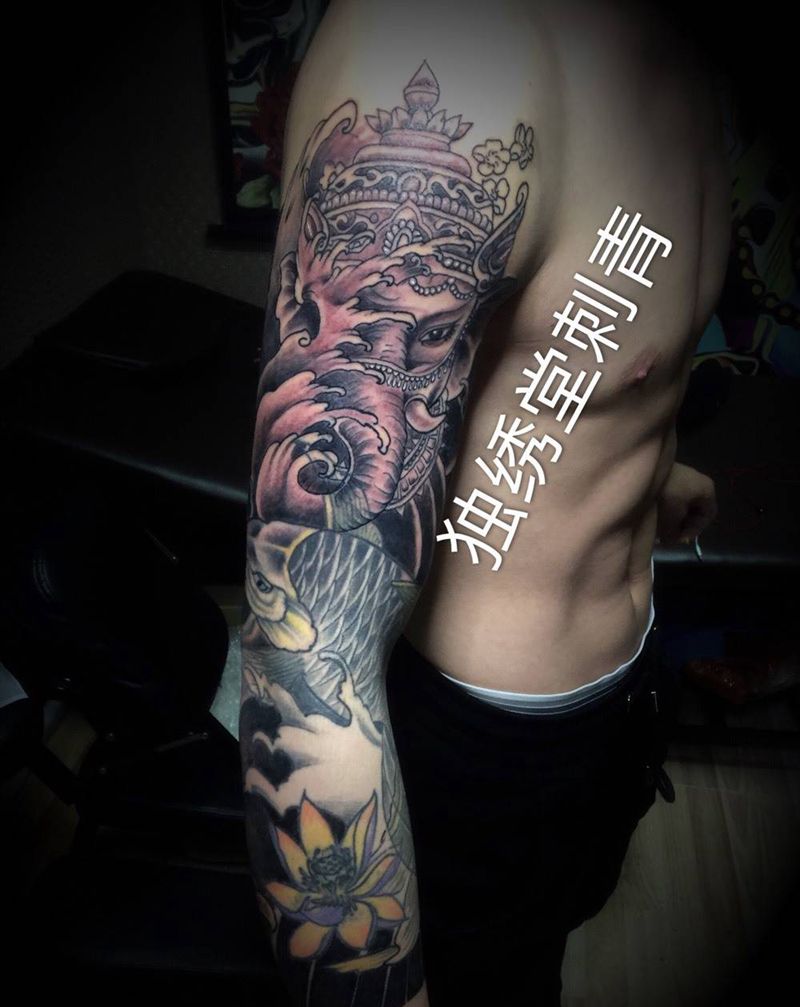 当前位置: 首页 >四川省南充市纹身店-独绣堂刺青纹身图案>象神锦鲤新传统花臂纹身图片