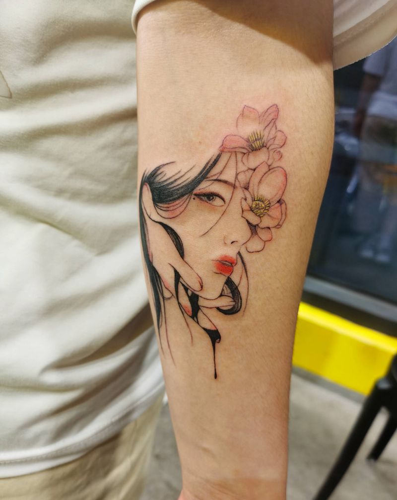 美女头像纹身图片_手臂水彩纹身图案