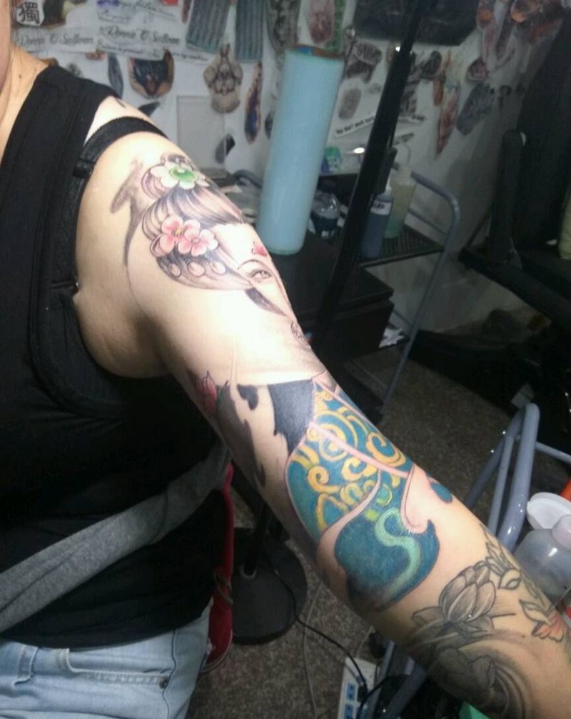 当前位置: 首页 >四川省广安市纹身店-安·刺青纹身图案>半臂彩色艺妓纹身图片