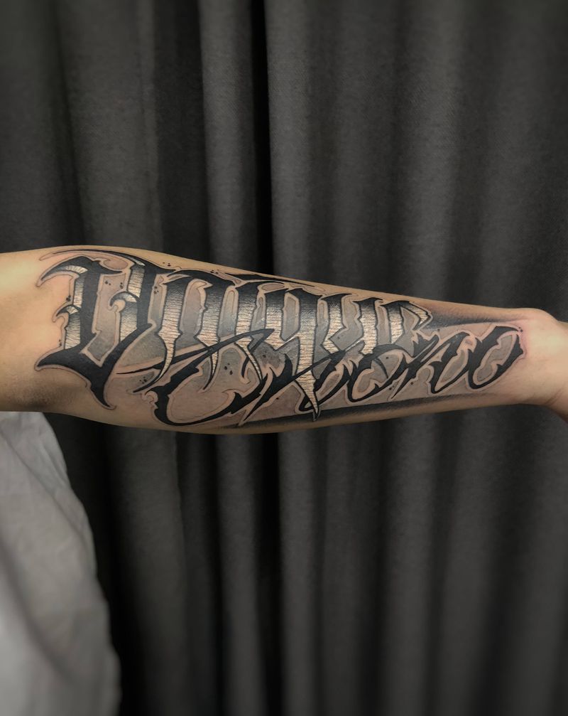 当前位置: 首页 >四川省宜宾市纹身店-宜宾古刺青纹身图案>花体遮盖纹身图片_手臂花体字纹身图案