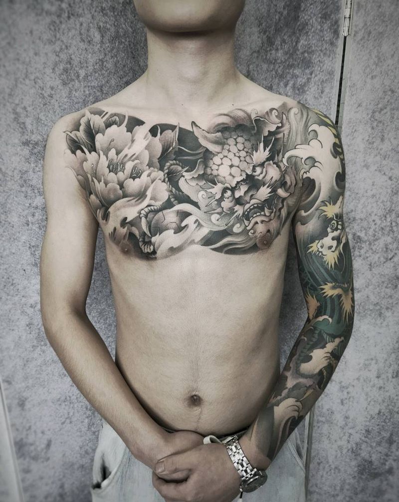 当前位置: 首页 >四川省宜宾市纹身店-宜宾古刺青纹身图案>花臂花胸纹身图片_手臂胸部新传统纹身图案
