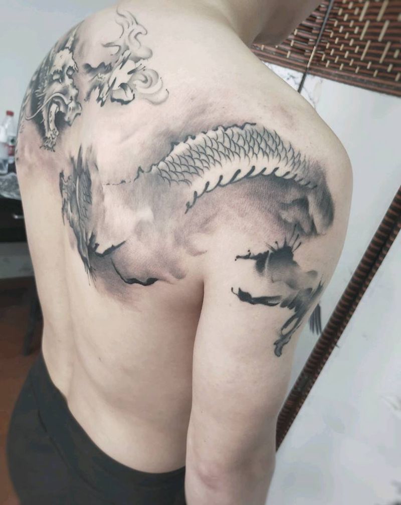 六龙图纹身图片_背部水墨纹身图案
