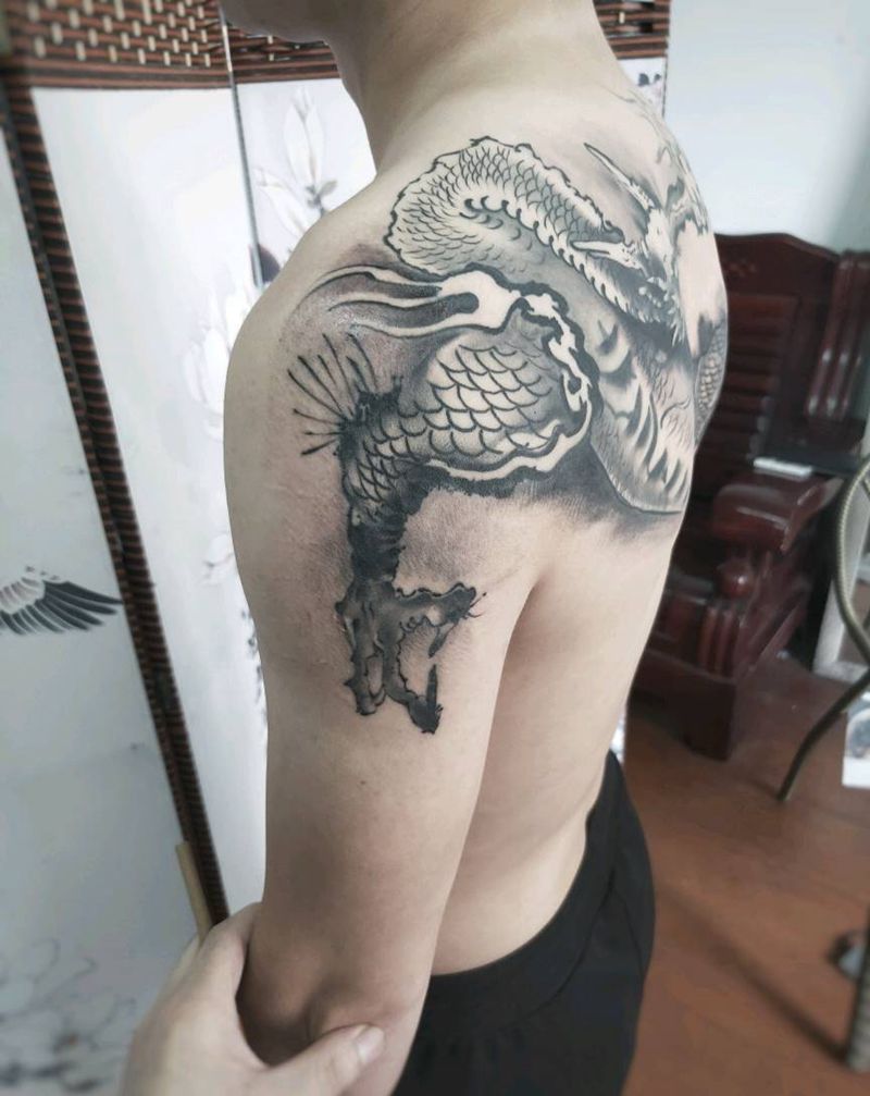 六龙图纹身图片_背部水墨纹身图案