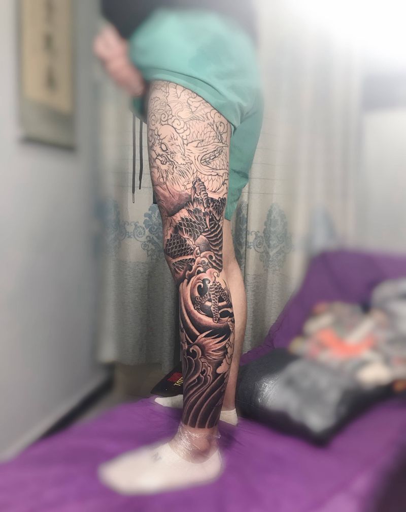 • T网红王老大花腿龙纹身图片_腿部新传统纹身图案