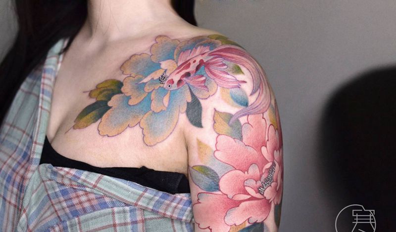 鱼、牡丹纹身图片_肩部手臂水彩纹身图案