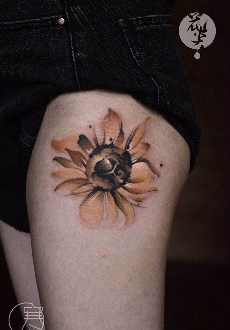 当前位置: 首页 >四川省宜宾市纹身店-寒舍刺青坊纹身图案>向日葵纹身图片_腿部水彩纹身图案