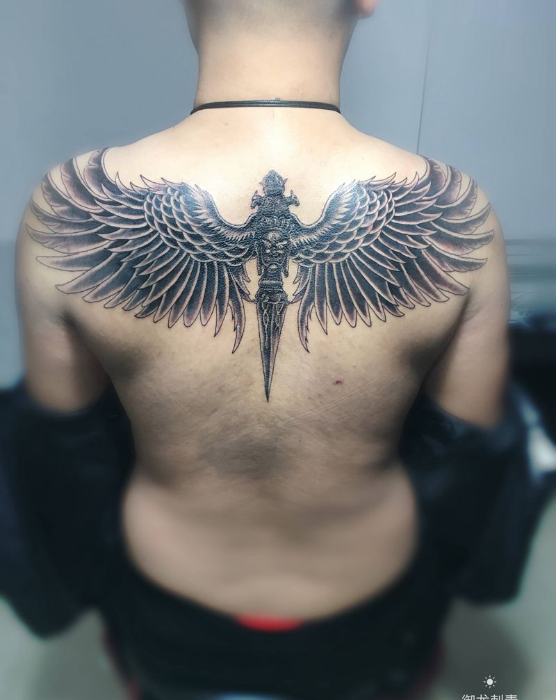 翅膀纹身图片_背部新传统纹身图案