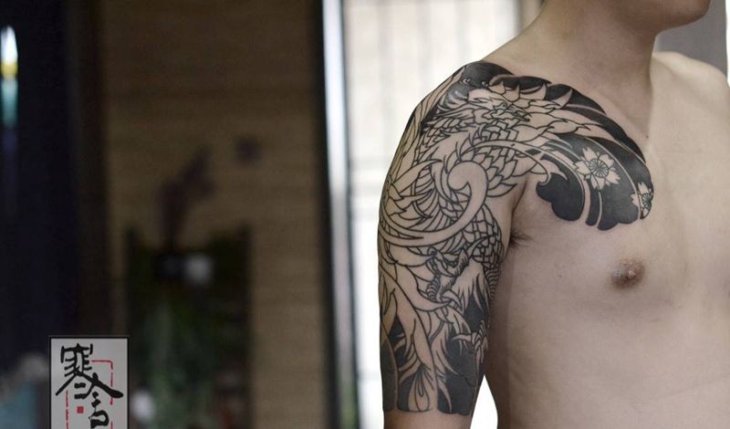 当前位置: 首页 >四川省宜宾市纹身店-寒舍刺青坊纹身图案>凤凰纹身图片_成品胸部手臂传统动物纹身图案