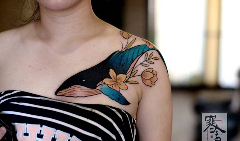 鲸,遮盖纹身图片_胸部肩部New School纹身图案