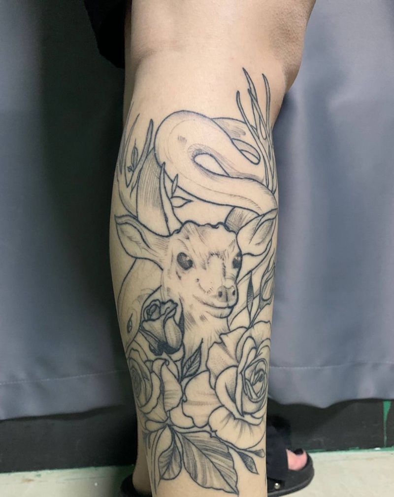 • T网红王老大花腿龙纹身图片_腿部新传统纹身图案