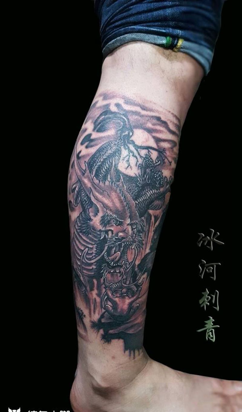 • T网红王老大花腿龙纹身图片_腿部新传统纹身图案