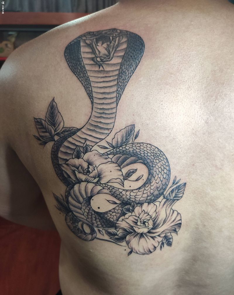 花蛇纹身图片_背部颈部新传统点刺纹身图案