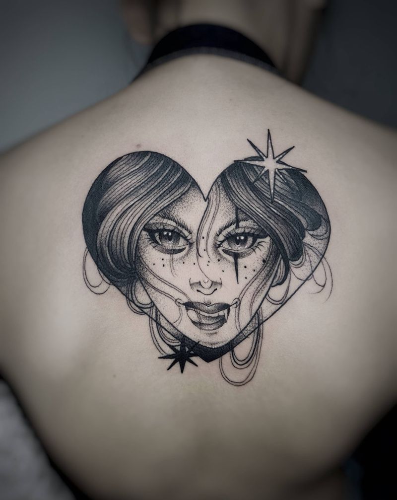 桃心女郎纹身图片_背部点刺纹身图案