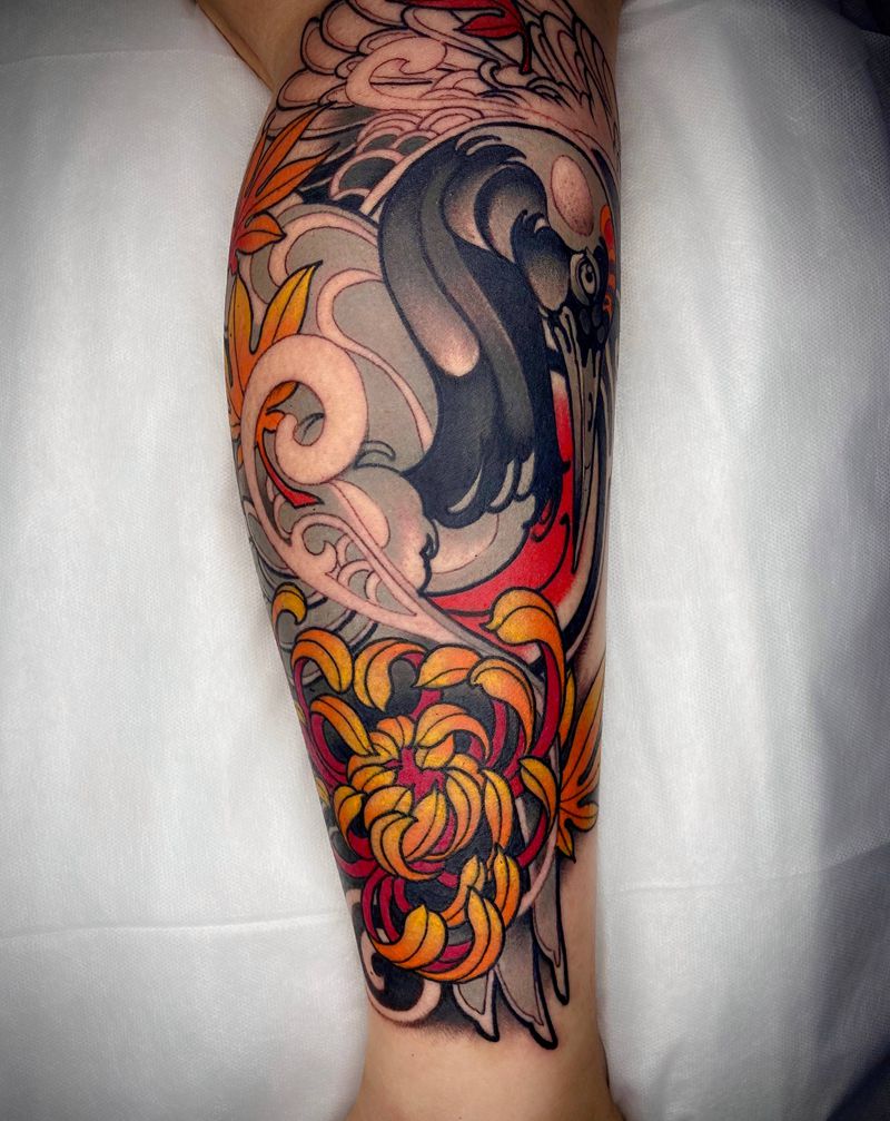 鹤纹身图片_腿部New School鹤菊花纹身图案