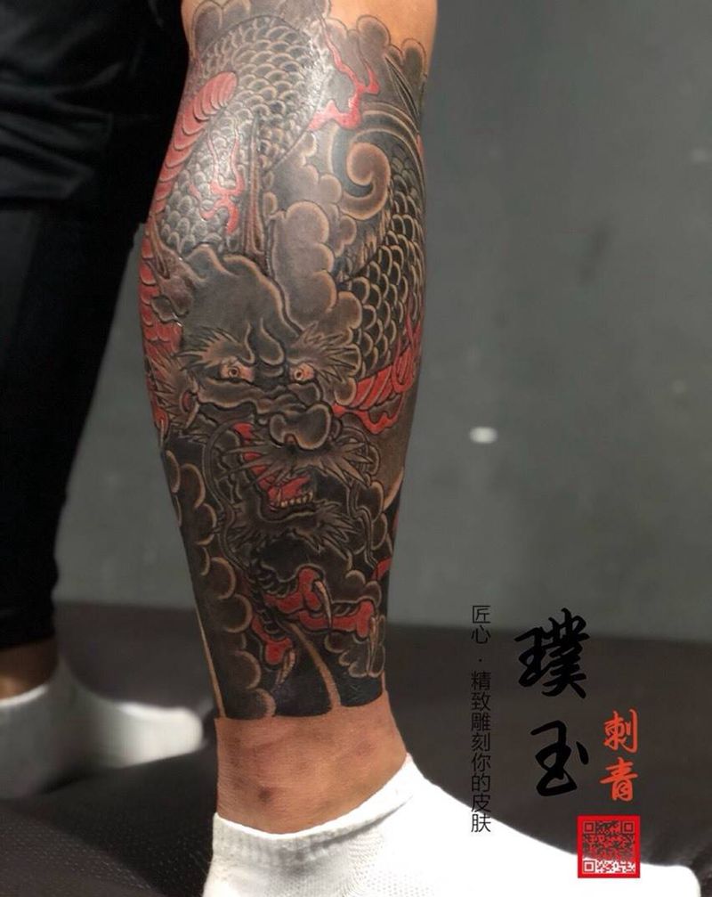 • T网红王老大花腿龙纹身图片_腿部新传统纹身图案