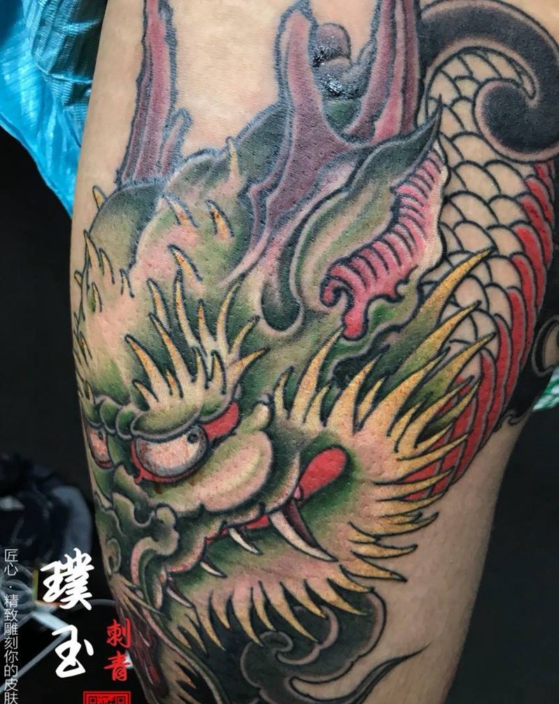 • T网红王老大花腿龙纹身图片_腿部新传统纹身图案