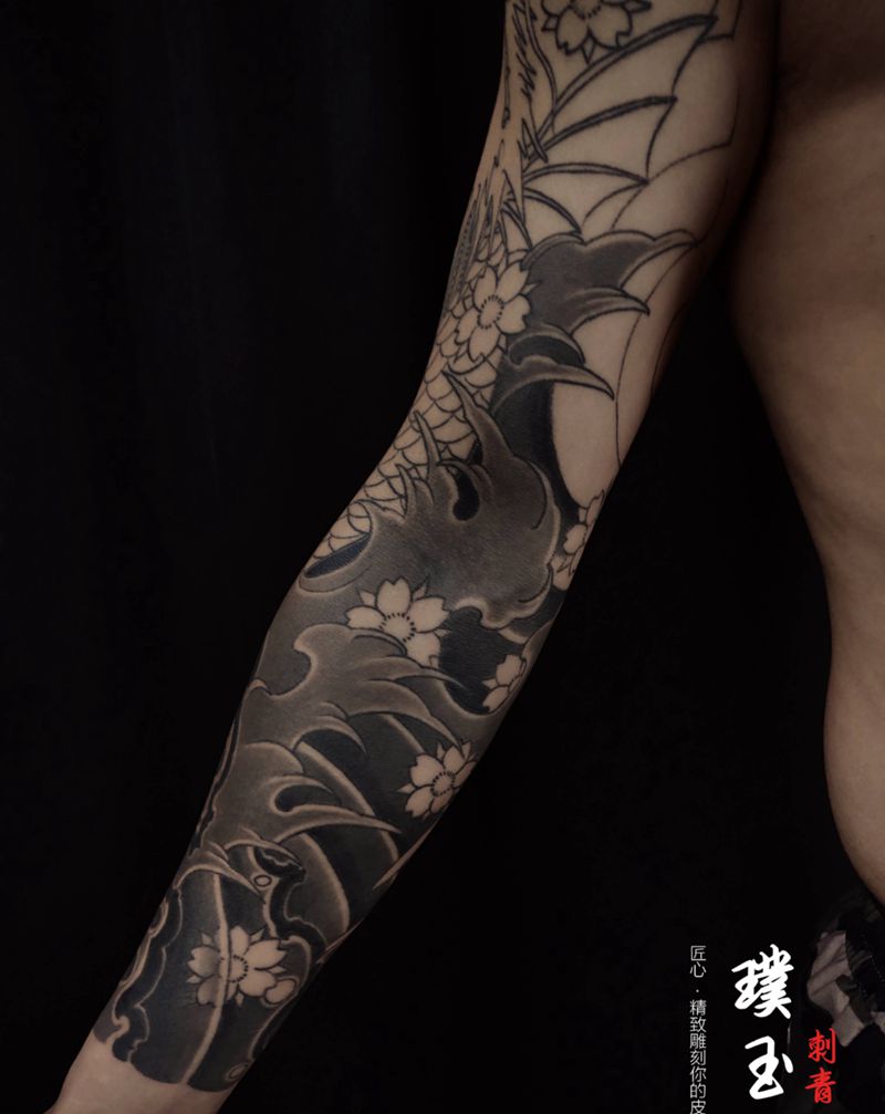 传统纹身图片_手臂老传统鱼樱花纹身图案