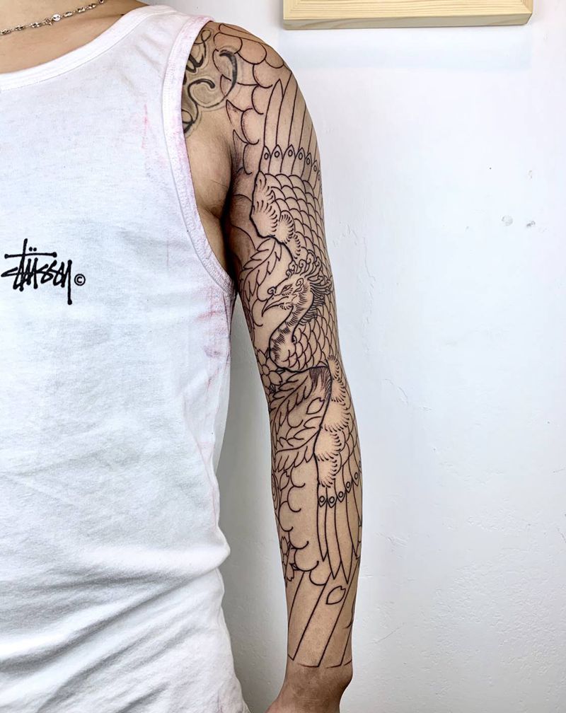 日式花臂《鸾凤》未完纹身图片_老传统风樱花纹身图案