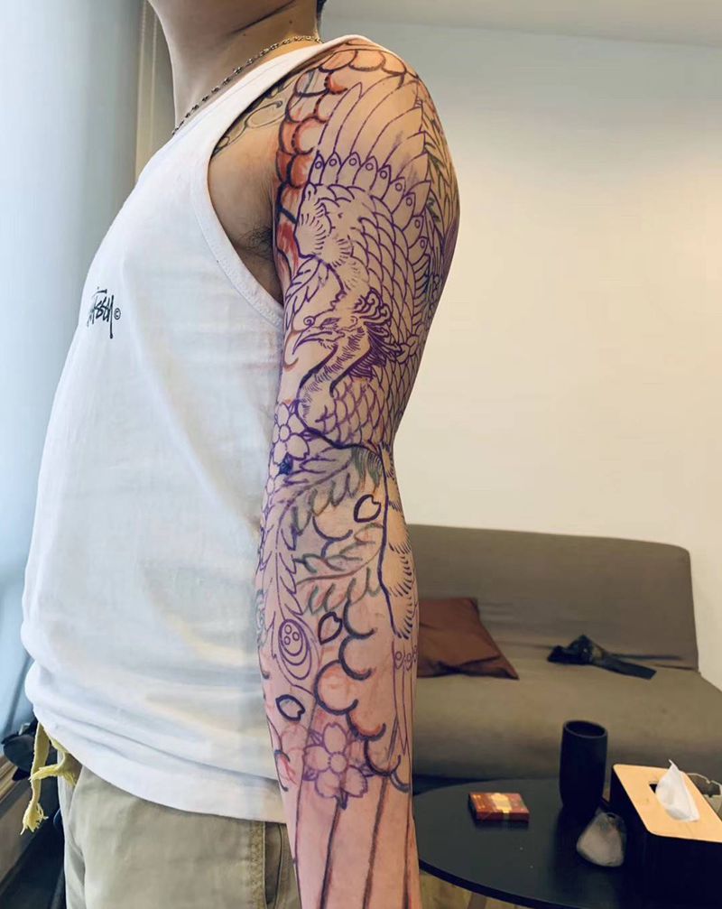 当前位置: 首页 >四川省达州市纹身店-璞玉刺青纹身图案>日式花臂《鸾凤》未完纹身图片_老传统风樱花纹身图案