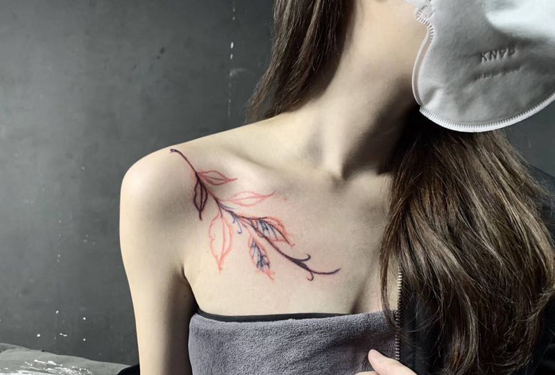 手绘遮盖纹身图片_肩部点刺叶子纹身图案