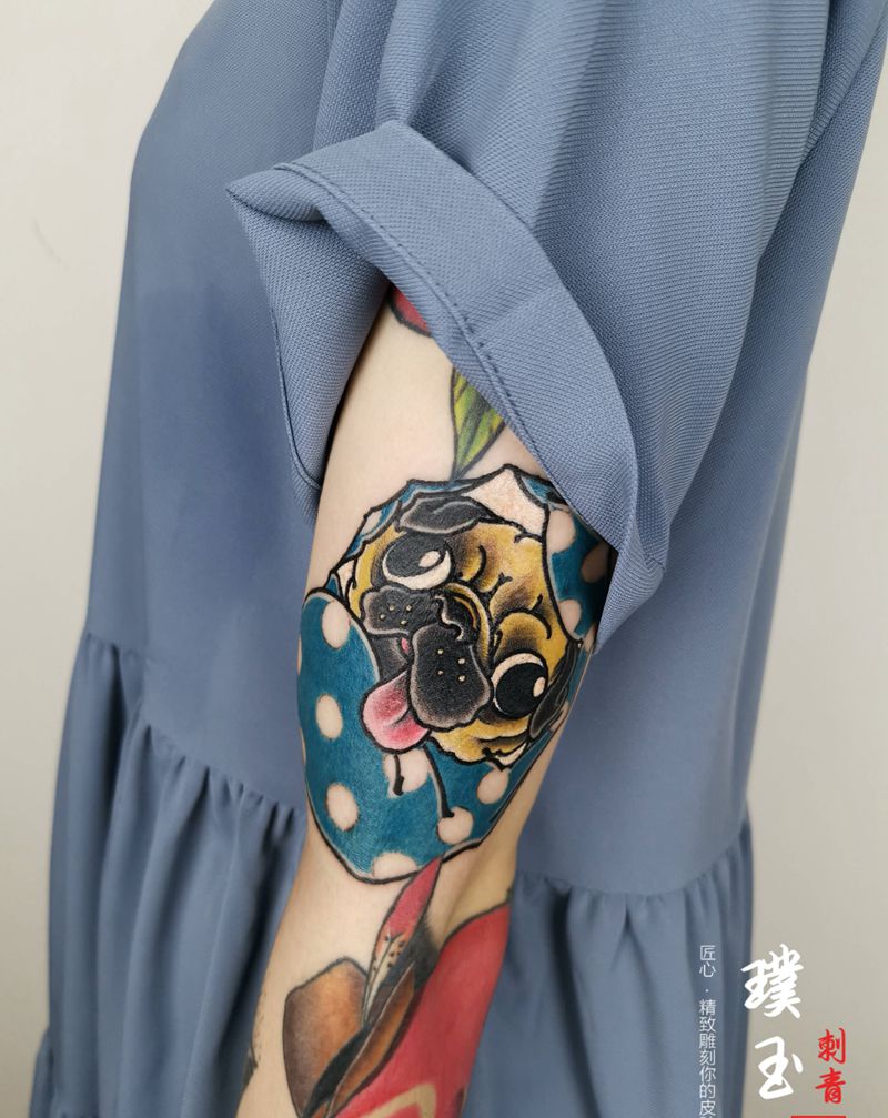 当前位置: 首页 >四川省达州市纹身店-璞玉刺青纹身图案>巴哥达摩蛋纹身图片_手臂老传统巴哥犬达摩蛋纹身图案
