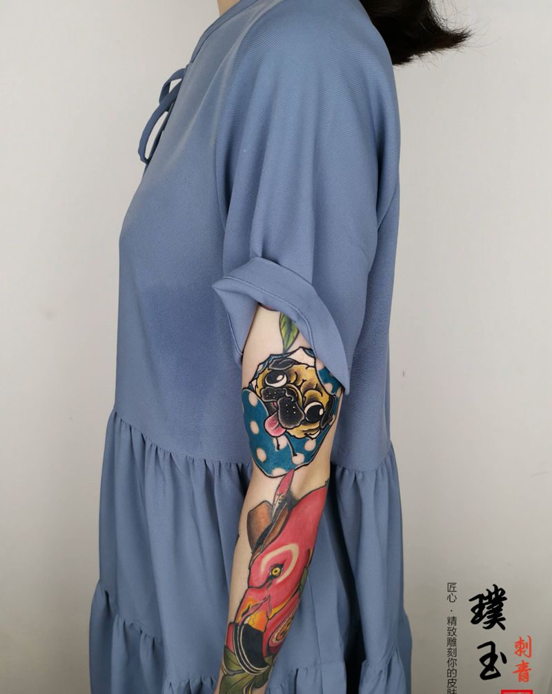 当前位置: 首页 >四川省达州市纹身店-璞玉刺青纹身图案>巴哥达摩蛋纹身图片_手臂老传统巴哥犬达摩蛋纹身图案