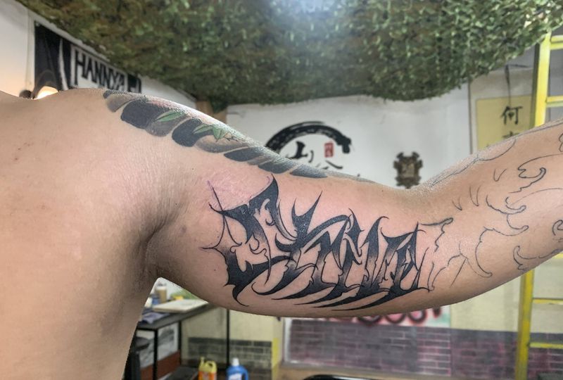 当前位置: 首页 >四川省巴中市纹身店-山兮纹身纹身图案>花体纹身图片_手臂花体字纹身图案