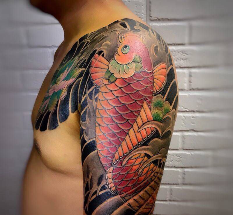 当前位置: 首页 >贵州省贵阳市纹身店-仟佰刺青纹身图案>鲤鱼半胛纹身图片_手臂老传统纹身图案