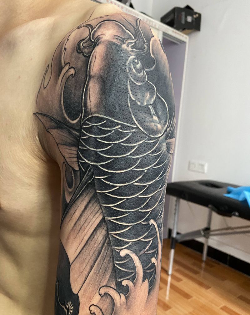 当前位置: 首页 >贵州省贵阳市纹身店-林刺青纹身图案>鲤鱼遮盖纹身图片_手臂新传统纹身图案