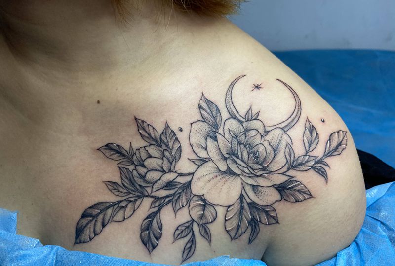 素花纹身图片_肩部点刺纹身图案