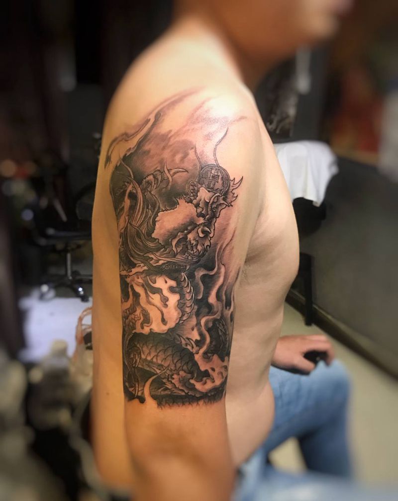 • T网红王老大花腿龙纹身图片_腿部新传统纹身图案