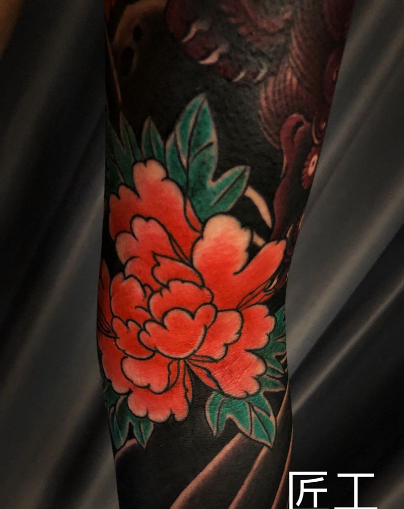 牡丹唐狮纹身图片_手臂老传统纹身图案