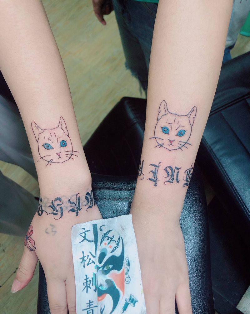 当前位置: 首页 >贵州省贵阳市纹身店-文松刺青(扎佐工作室)纹身图案>闺蜜图,卡通猫➕花体英文字母纹身图片_手部纹身图案