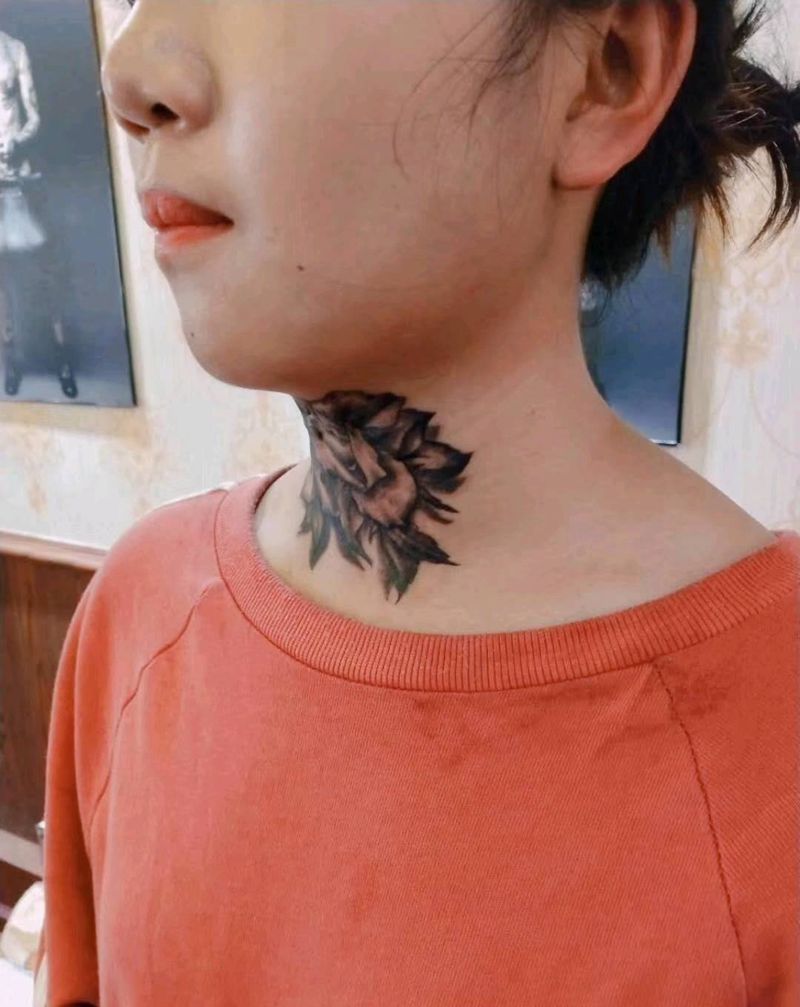 脖子伤疤遮盖,玫瑰花纹身图片_颈部欧美写实纹身图案