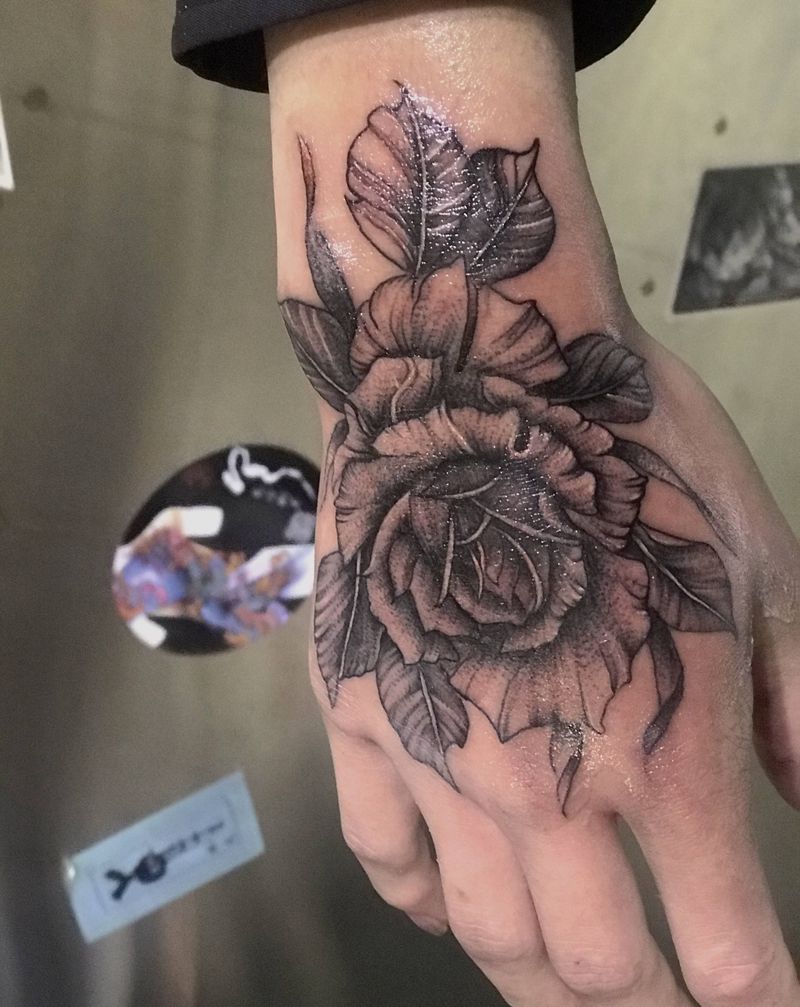 • 手背潮流时尚的玫瑰花眼睛纹身图案