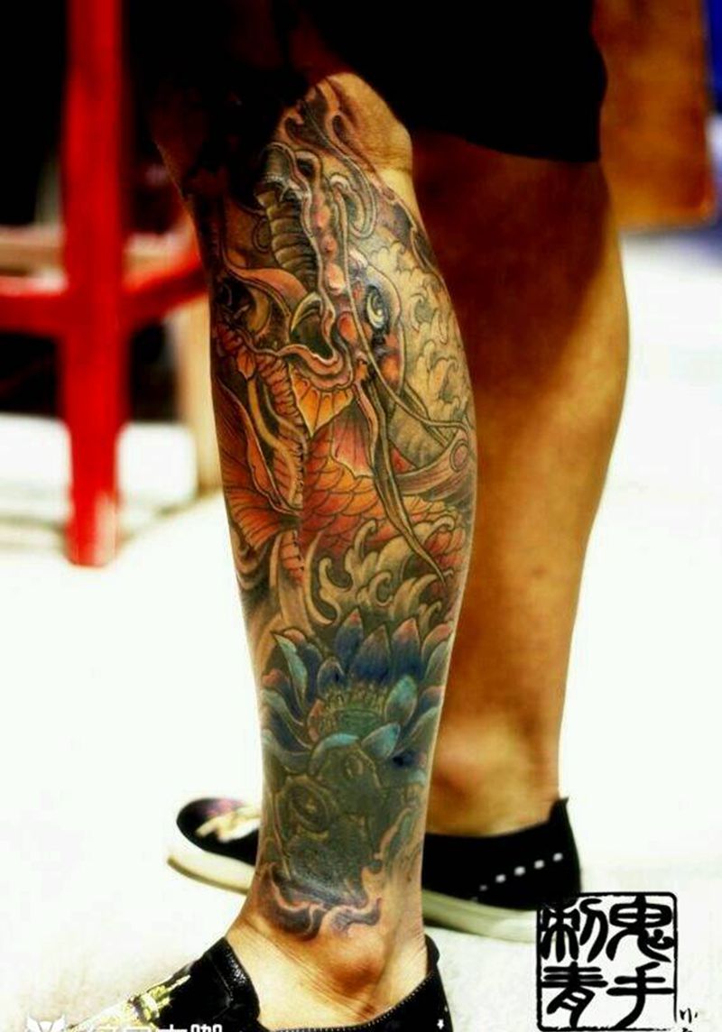 • T网红王老大花腿龙纹身图片_腿部新传统纹身图案