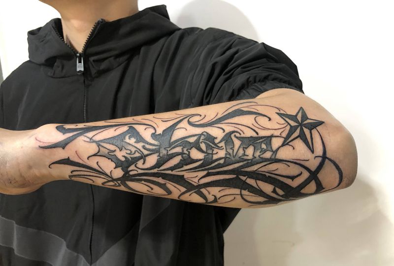 当前位置: 首页 >云南省昆明市纹身店-异士刺青纹身图案>花体字修改纹身图片_手臂花体字纹身图案