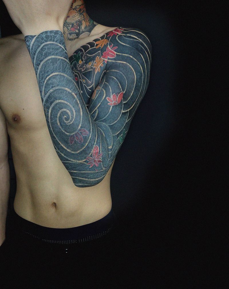• T网红王老大花腿龙纹身图片_腿部新传统纹身图案