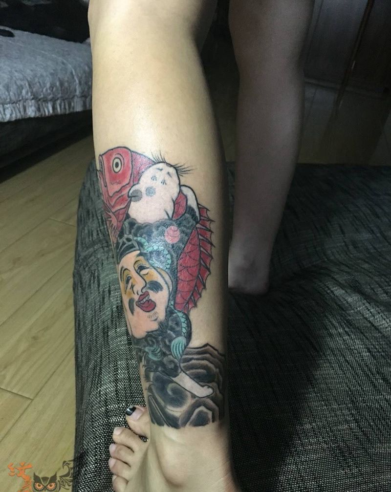 • T包小腿吹火男+阿多福纹身图片_腿部老传统新传统吹火男阿