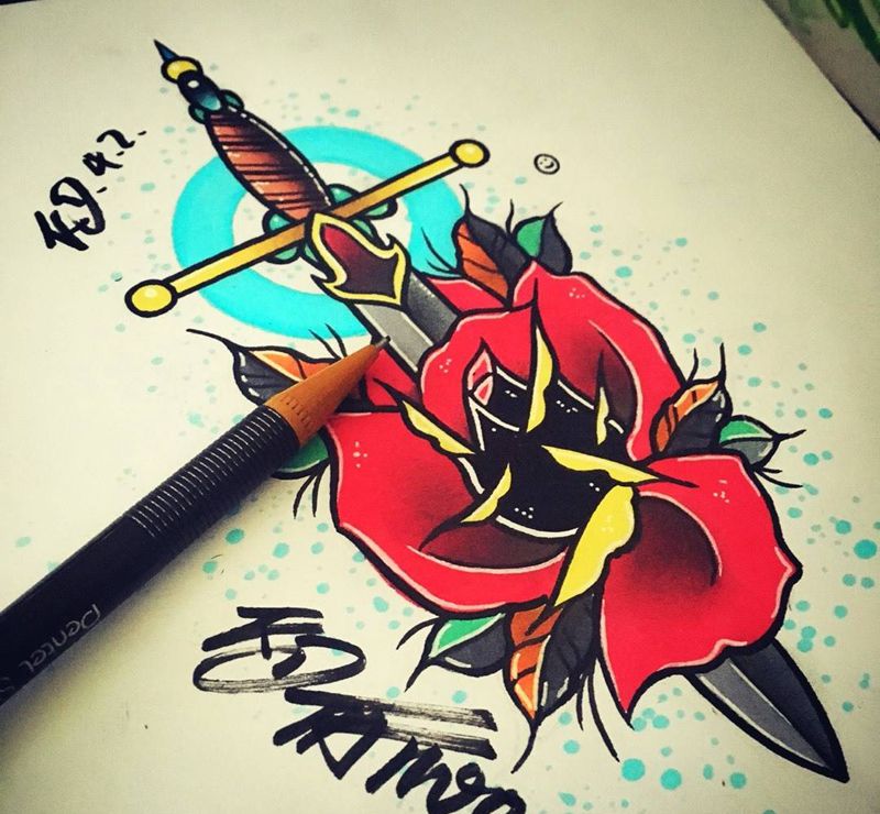 玫瑰匕首手稿@KD纹身图片_手稿插画成品欧美原创纹身图案