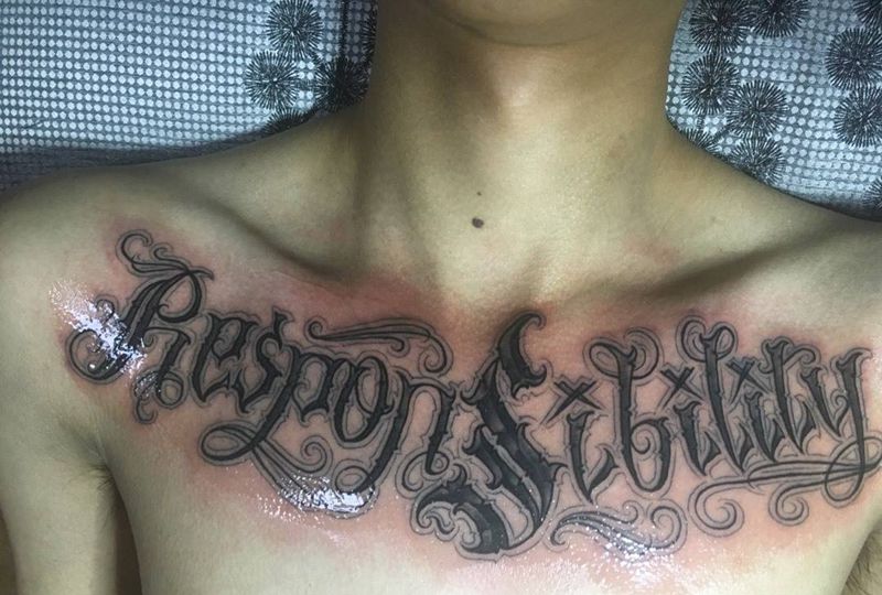 当前位置: 首页 >云南省昆明市纹身店-KD TATTOO Studio纹身图案>奇卡诺手写字体纹身图片_成品胸部欧美字符花体字奇卡诺匪帮纹身图案