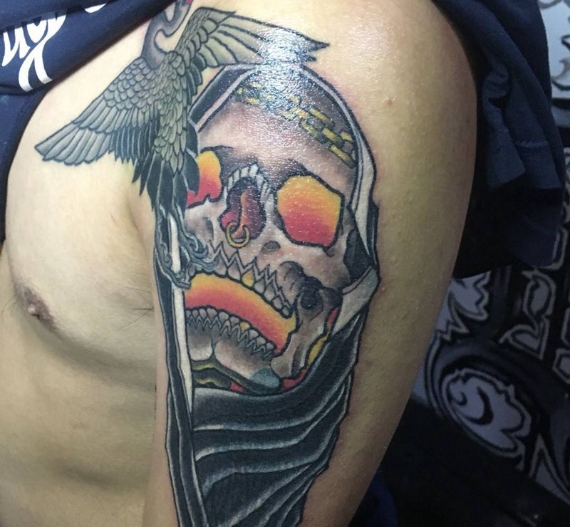 当前位置: 首页 >云南省昆明市纹身店-KD TATTOO Studio纹身图案>神雀遮盖纹身图片_成品手臂欧美遮盖骷髅纹身图案