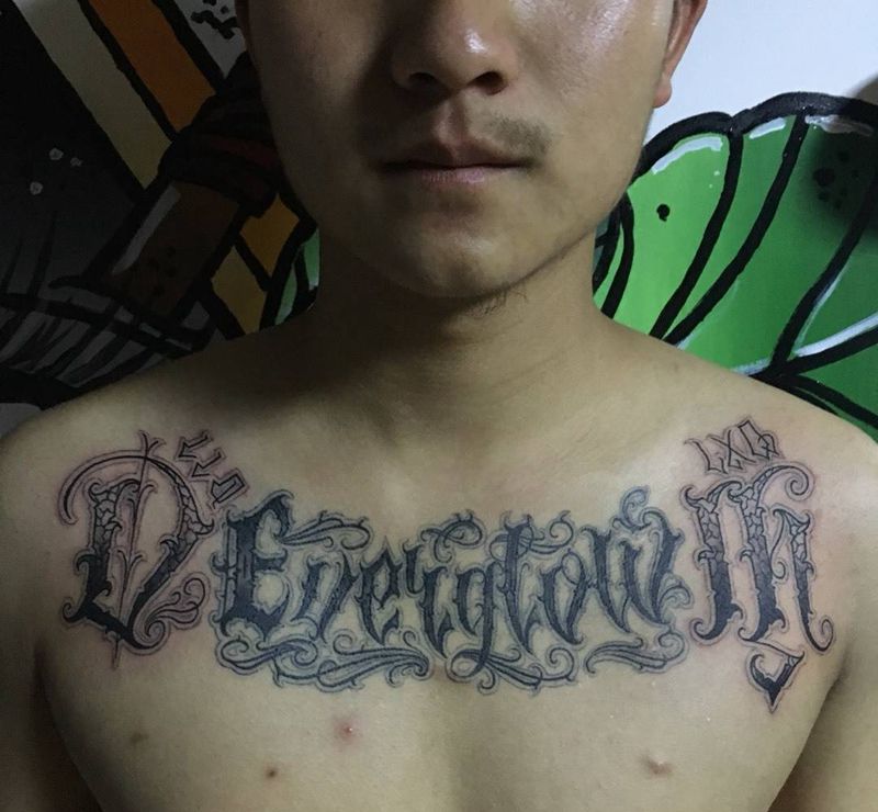 当前位置: 首页 >云南省昆明市纹身店-KD TATTOO Studio纹身图案>奇卡诺手写字体纹身图片_成品胸部欧美字符匪帮奇卡诺花体字纹身图案