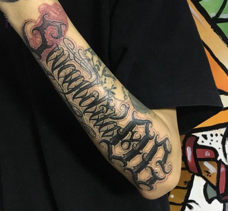 当前位置: 首页 >云南省昆明市纹身店-KD TATTOO Studio纹身图案>奇卡诺手写字体纹身图片_成品手臂欧美字符花体字奇卡诺匪气纹身图案