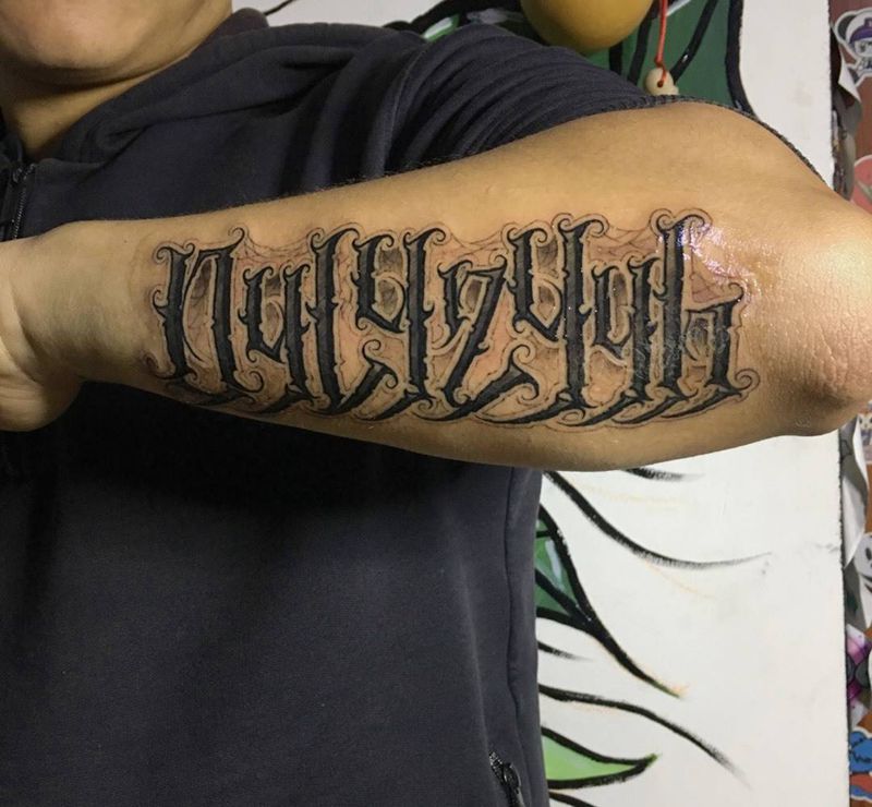 当前位置: 首页 >云南省昆明市纹身店-KD TATTOO Studio纹身图案>今天字体纹身图片_成品手臂欧美字符奇卡诺花体字匪气纹身图案