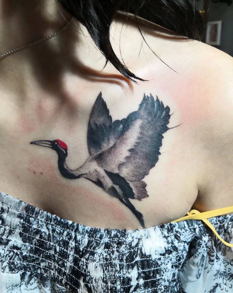 仙鹤遮盖纹身图片_胸部水墨纹身图案